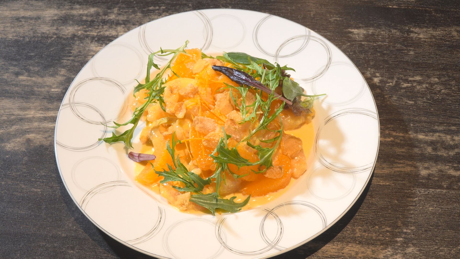 - 皿に高さを出すように盛り付け、タンカンやベビーリーフ、コーンフレークを飾れば完成♪