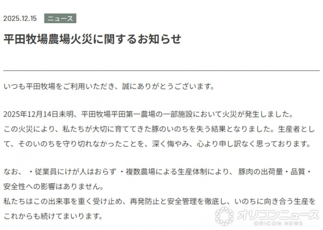 山形の平田牧場は15日、公式サイトに「平田牧場農場火災に関するお知らせ」を掲載した。 「2025年12月14日未明、平田牧場平田第一農場の一部施設において火災が発生しました。この火災により、私たちが大切に育ててきた豚のいのちを失う結果となりました。生・・・
