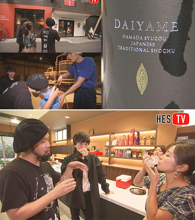 続いて向かったのは去年のHESでもお世話になった濵田酒造。特に「本格芋焼酎だいやめ〜DAIYAME〜」はアーティストがSNSにアップするほどの焼酎。3人は明治元年創業当時の道具や現在の焼酎つくりの様子、そして試飲も楽しみました。