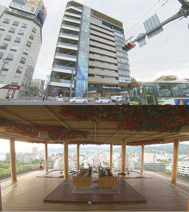平和記念公園や原爆ドームのすぐ近くにある「おりづるタワー」。屋上展望台は広島市内を一望できる絶景が広がります。 そして、屋上の1つ下の階には折り鶴を投函できる「おりづるの壁」が! おりづるタワーには物産館やカフェも併設され、多く観光客が訪れています。