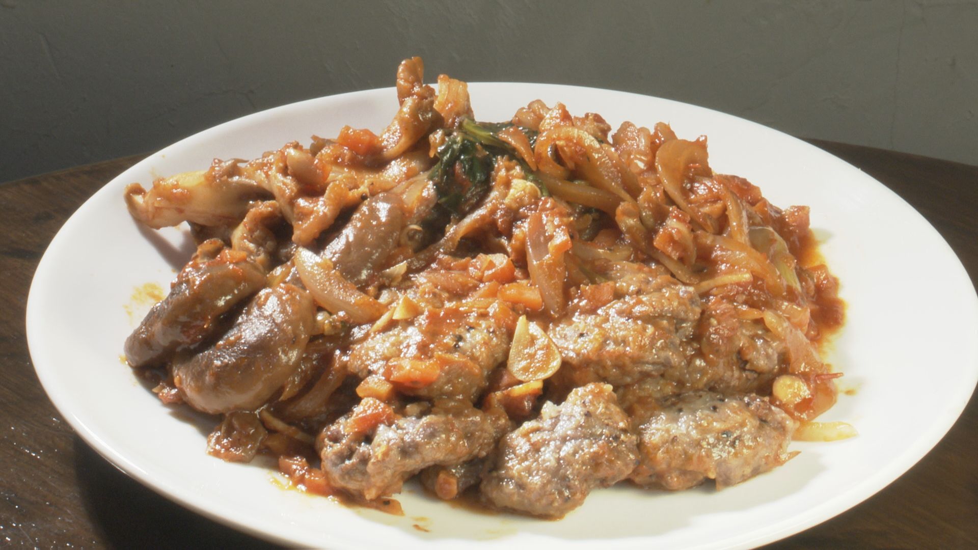 - フライパンにオリーブオイルをしき、牛肉に軽く裏表焼き目がつく程度焼き、焼き目がついたら皿に取り出す