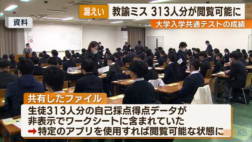 先月行われた大学入学共通テストについて県立高校の受験生313人の自己採点のデータが、担当教諭のミスでほかの生徒が閲覧でき・・・