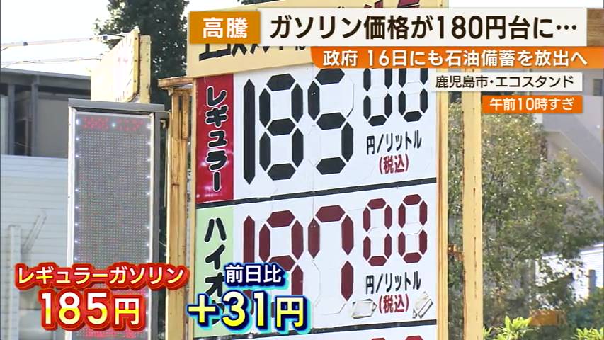 政府 16日にも石油備蓄を放出へ ガソリン価格180円台…値上げ相次ぐ