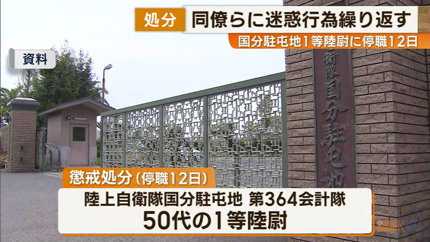 国分駐屯地1等陸尉に停職12日 同僚の隊員らに迷惑行為を繰り返す 鹿児島