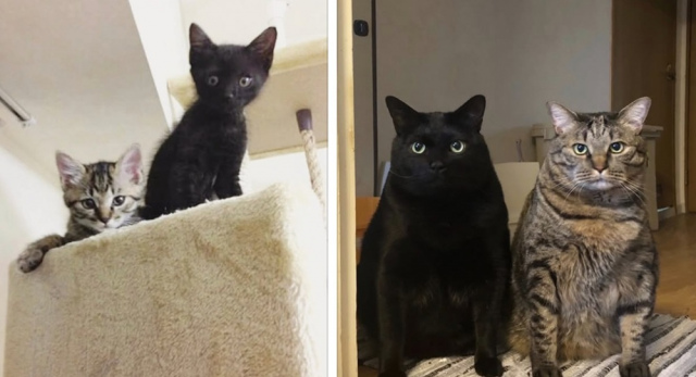 「ボーダーぱつぱつ兄弟」として紹介された2匹の猫の現在と過去を比較した写真がThreadsに投稿され、20万表示、1.3万いいねの反響を集めている。投稿したのはここさん(@coco_nyanco2)。「小さいときは小さかったんですよ」というコメントとともに投・・・