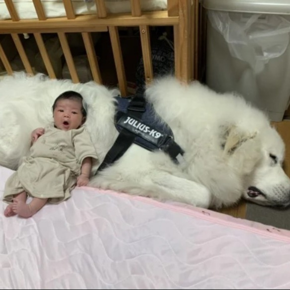 動物と子どもが仲睦まじそうにしている姿は、見ているだけで心が和み、度々注目を集める。モフモフの大型犬・グレートピレニーズの上で横になる生後1ヵ月の赤ちゃんの姿が、「シン・もののけ姫?」などと、反響を呼んだ。一方、0歳児の腕枕で寝る猫が、「寄り添って寝てるのが・・・